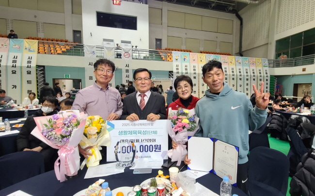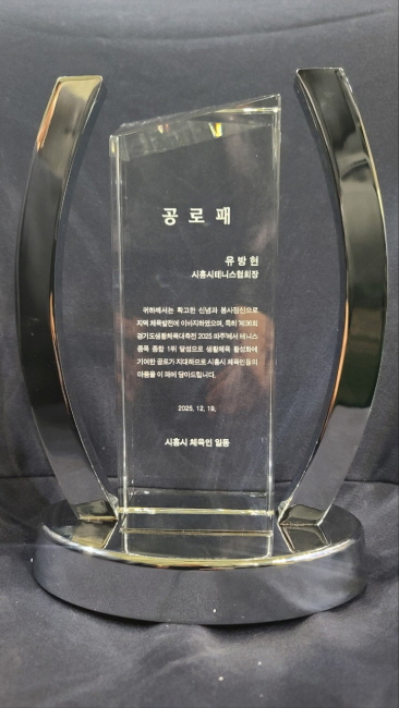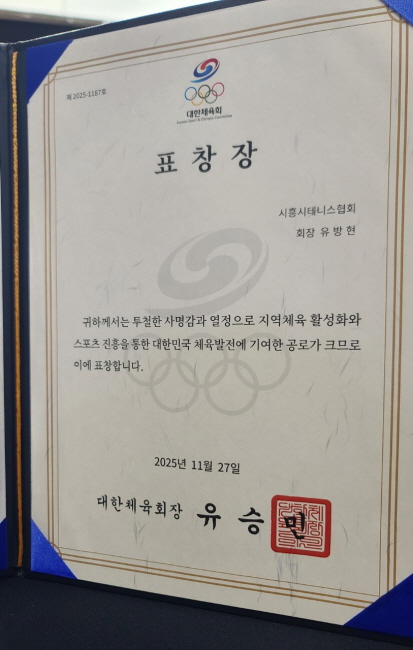 시흥시테니스협회는 2025년 시흥시 체육인의 밤 행사에서지역 체육 발전과 생활체육 활성화에 기여한 공로를 인정받아대한체육회장 표창장과 공로패를 수상하였으며,아울러 포상금 2,000,000원을 수여받았습니다.대한체육회장 표창은투철한 사명감과 열정으로 지역체육 활성화와 스포츠 진흥을 통해대한민국 체육 발전에 기여한 공로를 인정받아 수여된 상입니다.또한 공로패는확고한 신념과 봉사정신으로 지역 체육 발전에 이바지하고, 특히 제36회 경기도생활체육대축전(2025 파주)**에서 테니스 종목 종합 1위 달성을 통해생활체육 활성화에 크게 기여한 공로를 기리기 위해시흥시 체육인 일동의 뜻을 담아 수여되었습니다.이번 수상은 협회 임원진과 선수, 동호인 여러분 모두가한마음으로 함께 노력해 온 결과이며,시흥 테니스의 위상과 저력을 다시 한번 확인하는 뜻깊은 성과입니다.시흥시테니스협회는 앞으로도지역사회와 함께하는 건강한 테니스 문화 조성과생활체육 저변 확대를 위해 최선을 다하겠습니다.항상 협회를 믿고 함께해 주시는모든 이사님과 선수, 동호인 여러분께 깊이 감사드립니다.시흥시테니스협회 회장 유방현